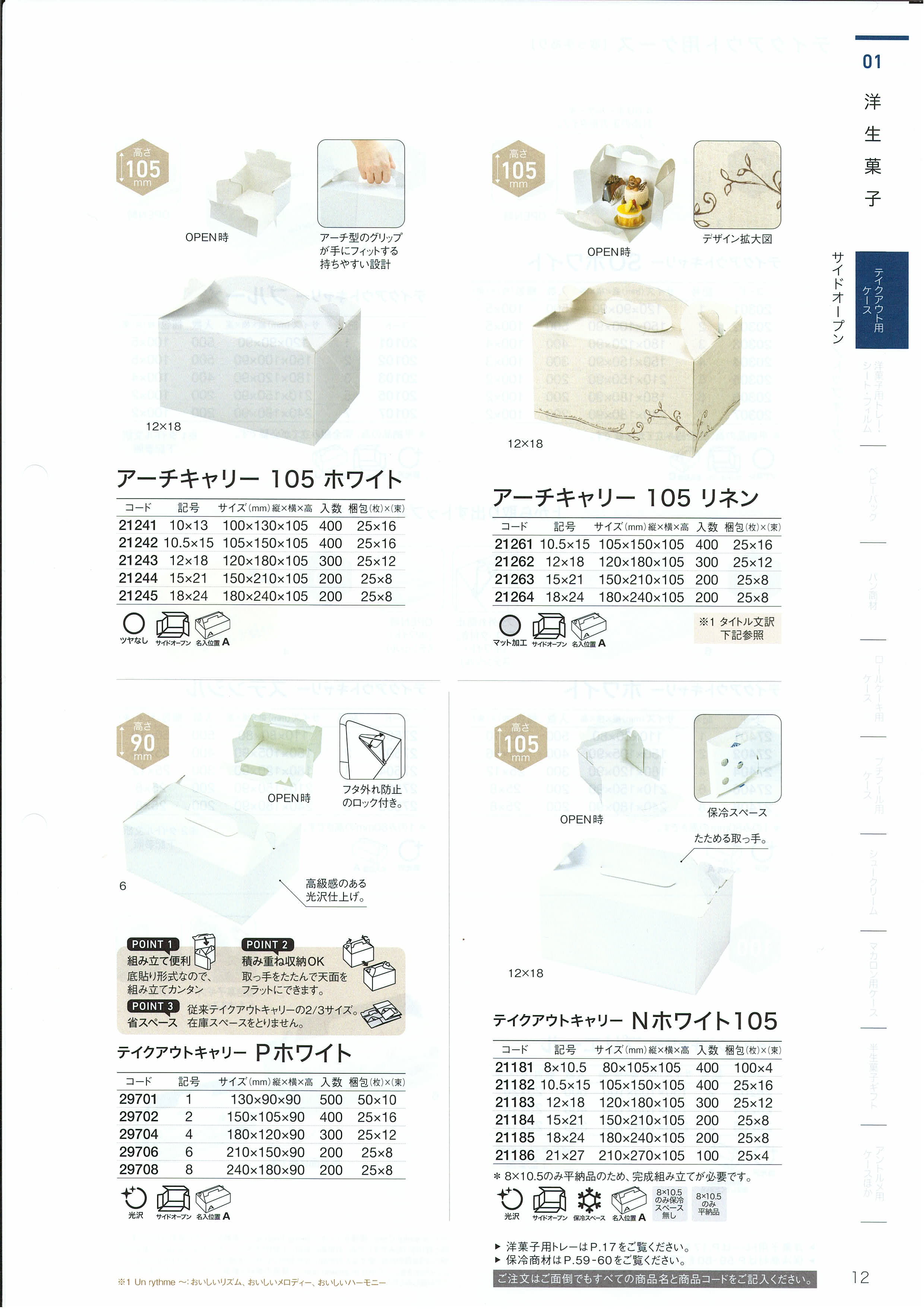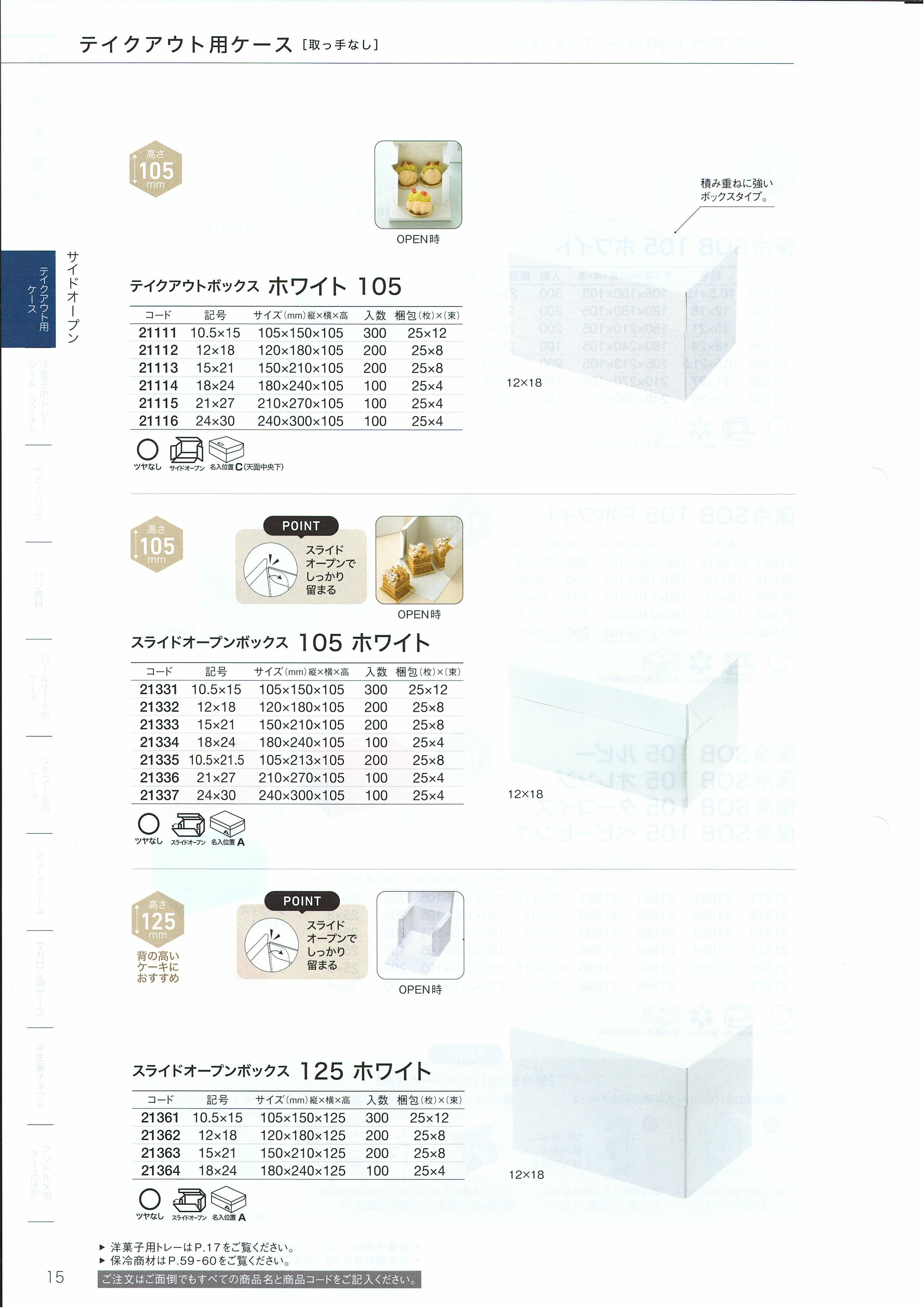 テイクアウトキャリー Nホワイト107 | 12X18 | 120 | 180 | 105 | 洋生菓子ケース | 300 |