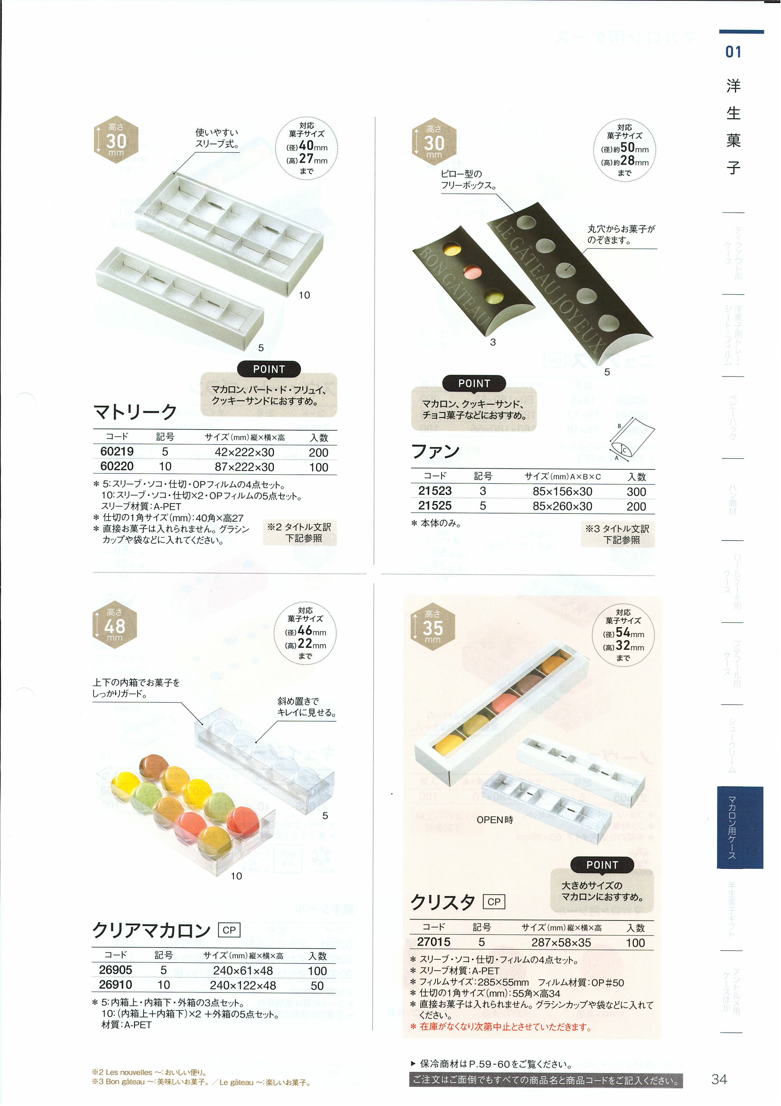 | 商品名 | 記号 | 長辺 | 短辺 | 高さ | 分類 | 入数 | |